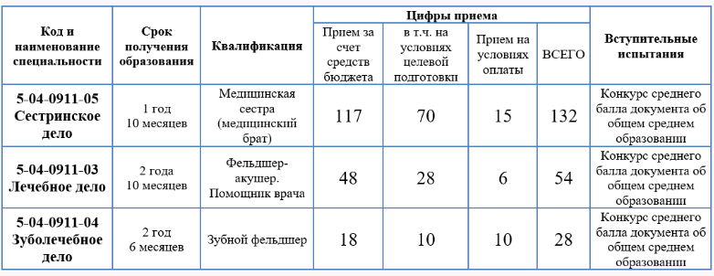 5-04-0911-03 Лечебное дело | На основе общего среднего | Фельдшер-акушер. Помощник врача. | Дневная, 2 года 10 месяцев |